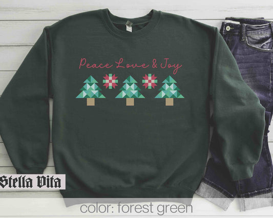 Peace Love and Joy Christmas Tree Quilt Block Sweatshirt