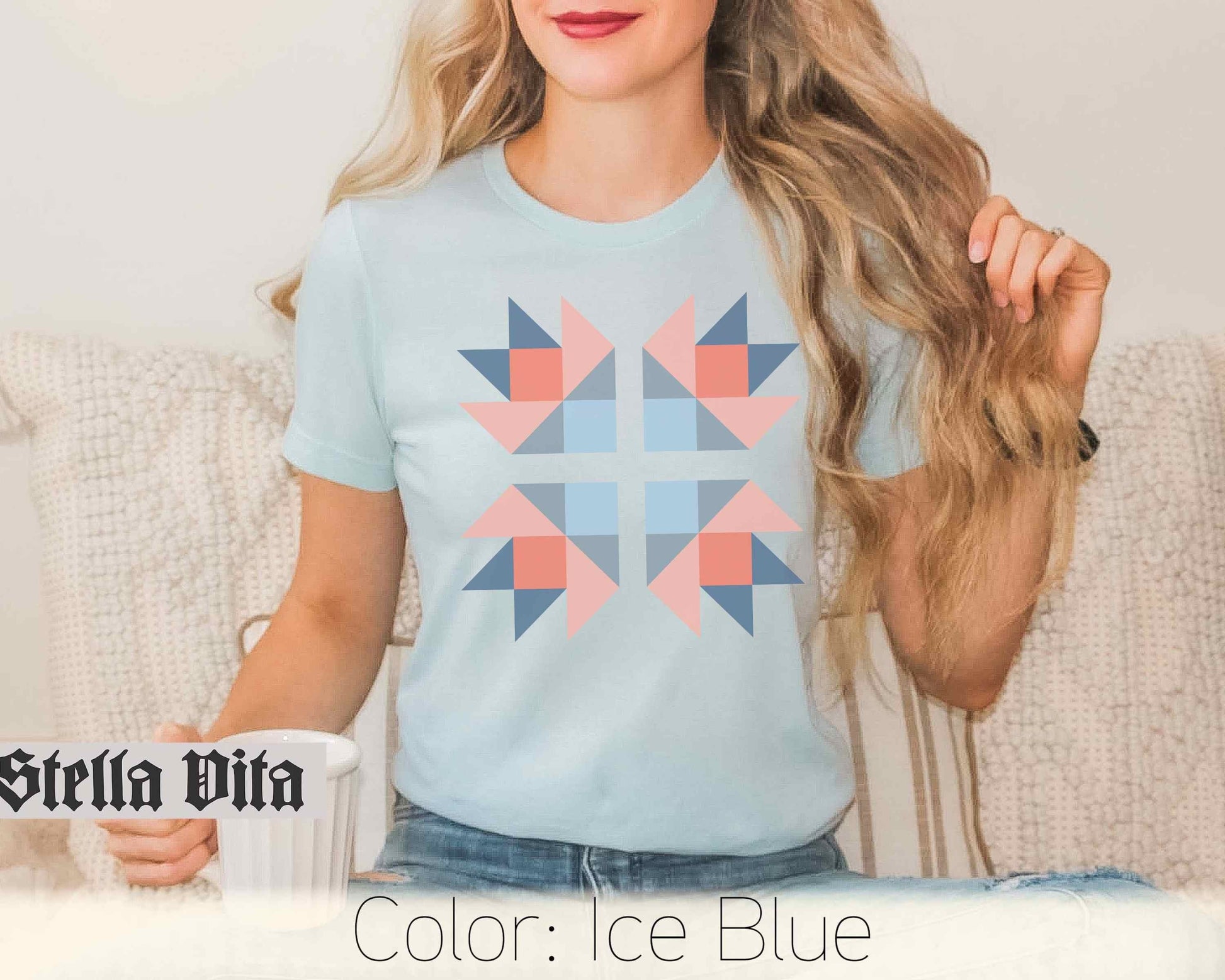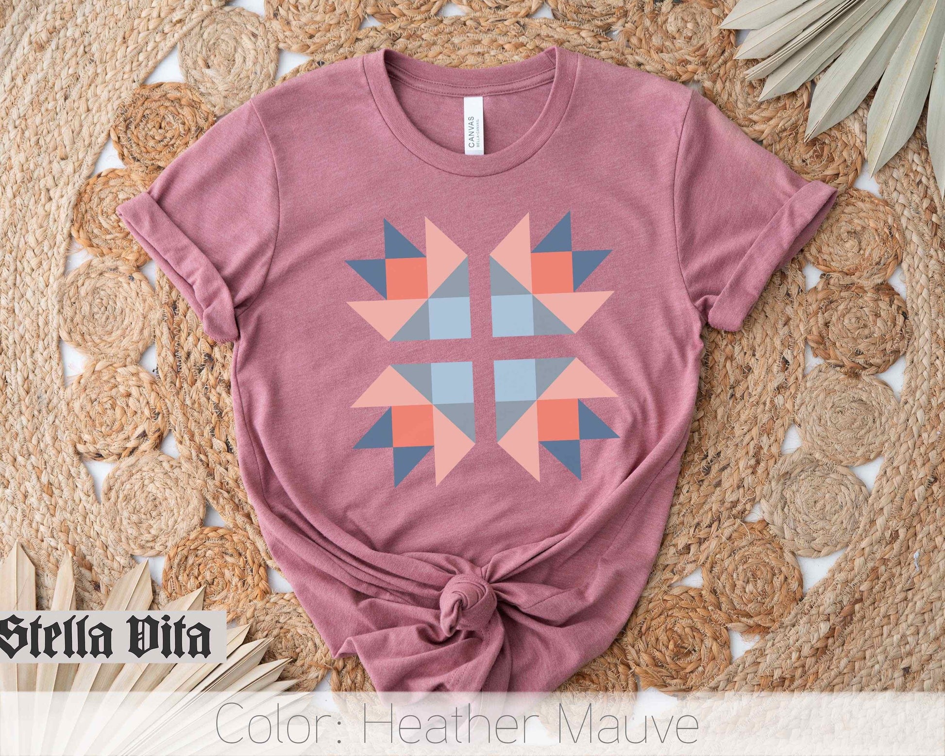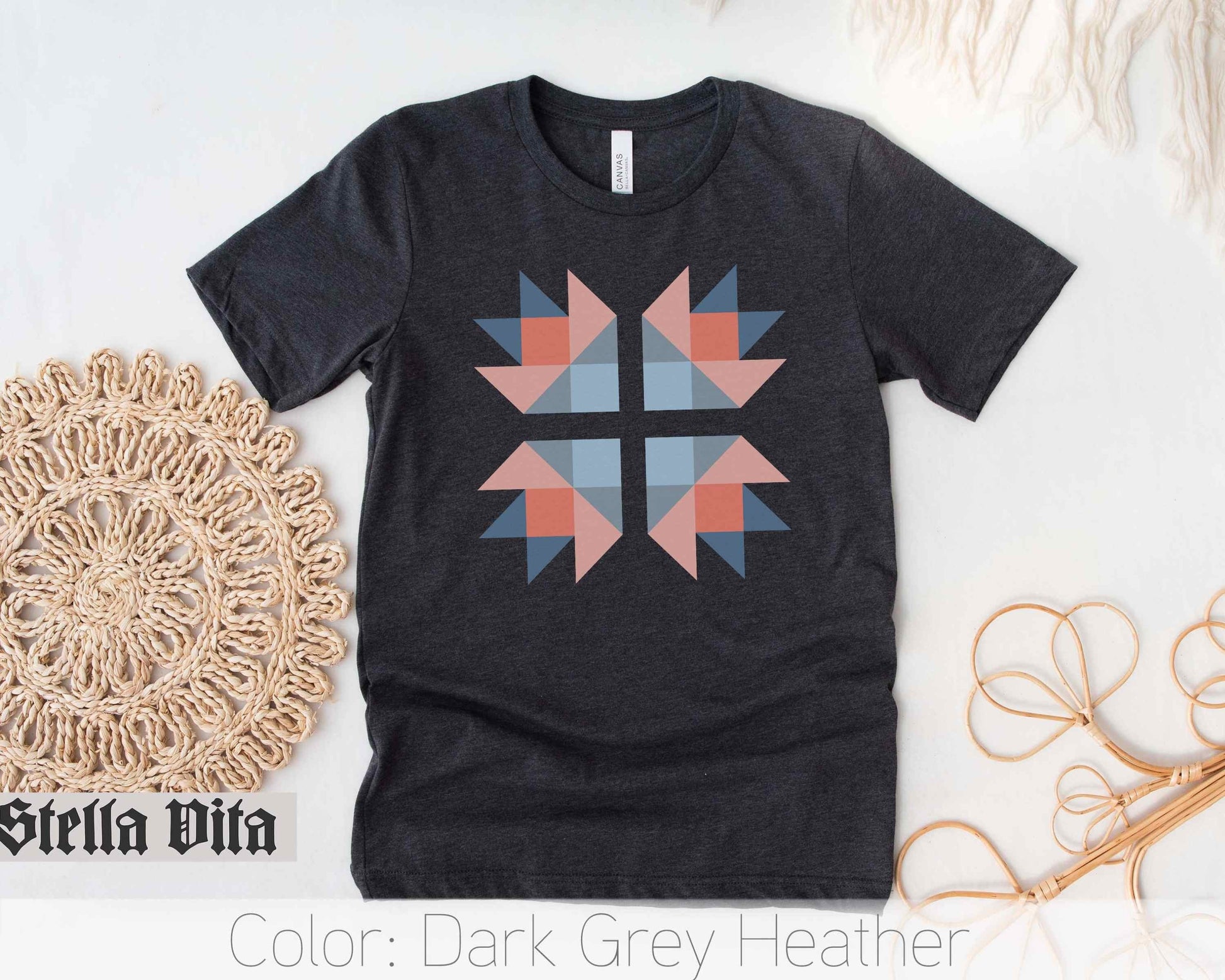 Introducing our new Bella and Canvas t-shirt, featuring a stunning bear paw quilt block print in a serene blue jean and peach color scheme. This lightweight shirt is a must-have for anyone who loves crafting and quilting, making it the perfect gift for the quilters in your life – whether it's your mom, grandma, or sister.