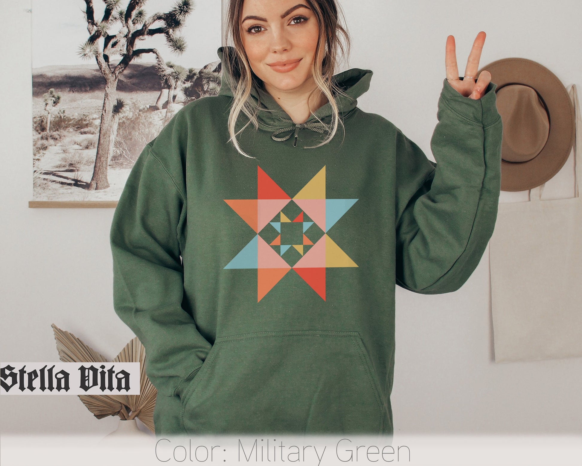 The image on the front of the sweatshirt showcases a captivating Morning Star quilt block with a bold geometrical emphasis. The intricate design and precise lines highlight the artistry and creativity of quilting. Whether you're a seasoned quilter or simply appreciate the beauty of quilt blocks, this sweatshirt allows you to showcase your passion for this timeless craft.