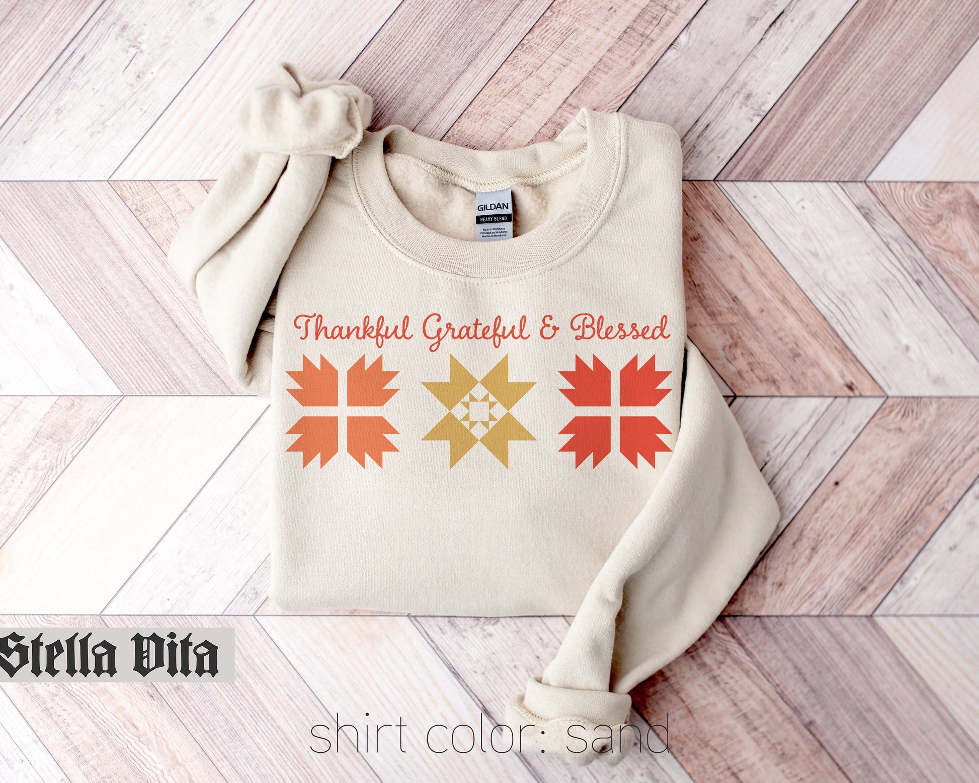 Introduce our Quilt Sweatshirt, the perfect addition to your wardrobe for both comfort and style. Crafted with superior materials and attention to detail, this sweatshirt is built to last.Featuring three charming quilt blocks and the iconic phrase "Thankful Grateful & Blessed," this sweatshirt showcases your love for the timeless art of quilting. Add a touch of quilting elegance to your wardrobe and make a statement with this unique design. Get your Quilt Sweatshirt today and experience the cozy comfort and stylish flair it offers.
