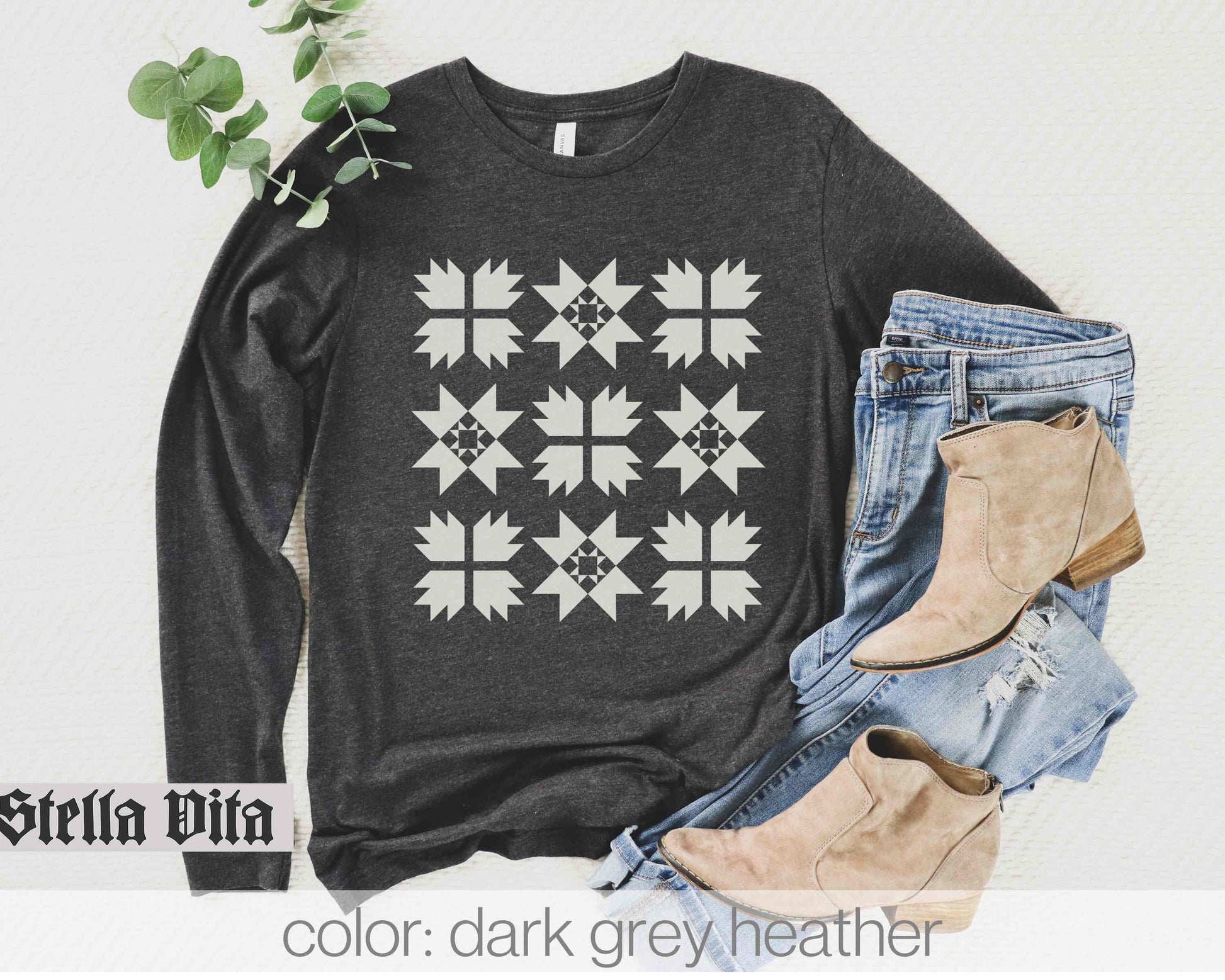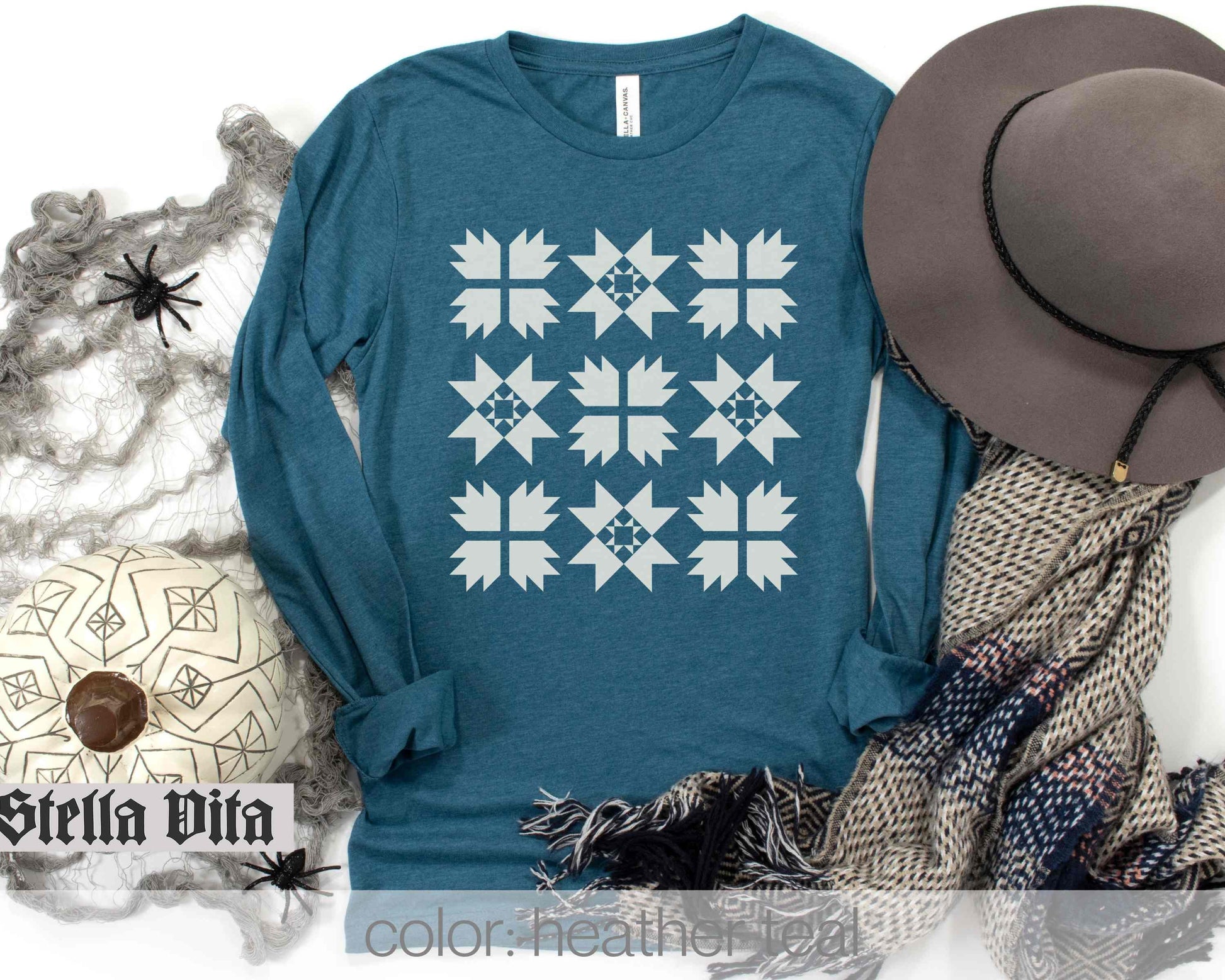 The stunning monochromatic nine quilt block design on the front adds a touch of rustic charm to any outfit. Its cottage core style is perfect for cozying up in during those chilly nights. This shirt also makes for a great gift for a mom or quilter, making it a versatile and thoughtful choice.